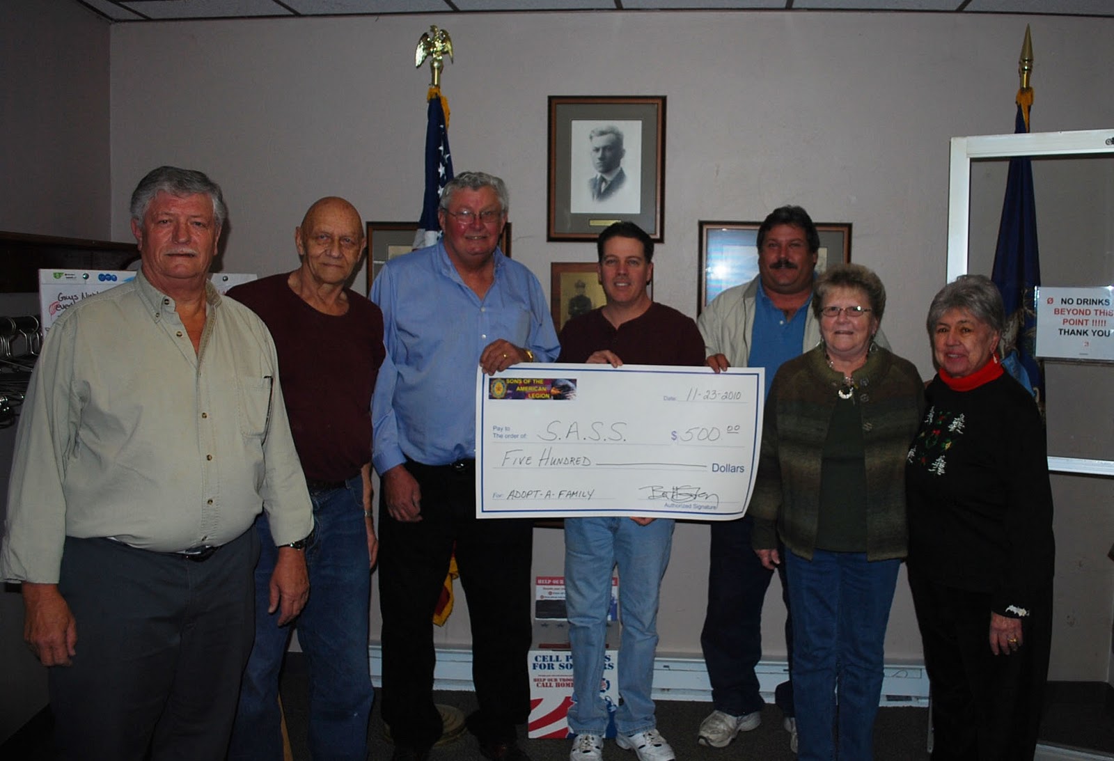 Sons of the American Legion member, Charlie Frey, said "Because our sauerkraut suppers were so successful this year, both the American Legion and the Sons of the American Legion have made a donation to SASS for the Holiday Adopt-A-Family program."